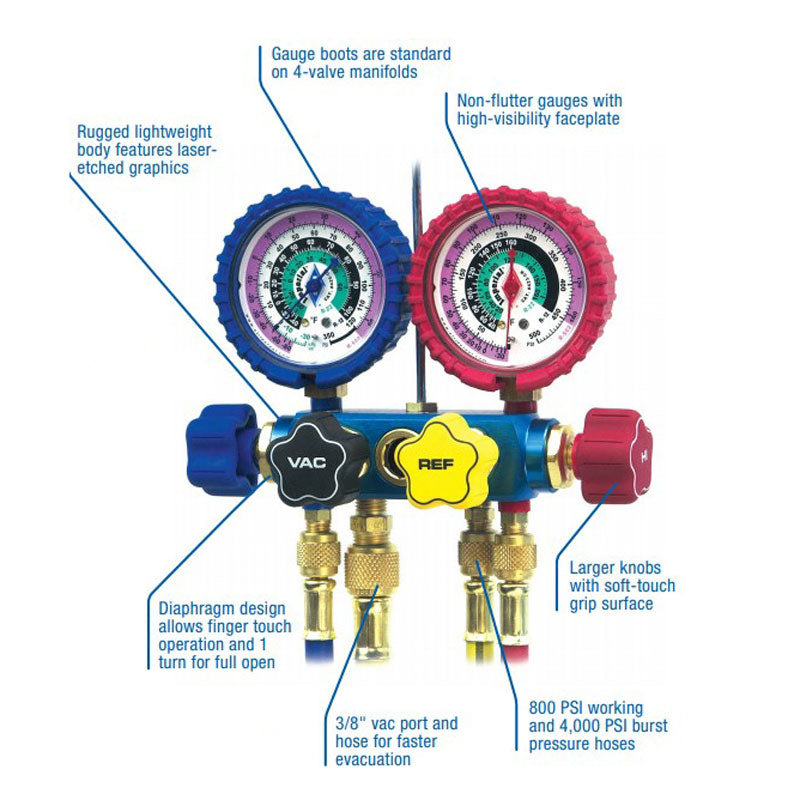 • 4 Times Faster Evacuation – 3/8" vacuum port and oversize internal passages evacuate systems four times faster than ordinary manifolds. 3/8" port has greater area than combined inlets of high and low side lines.
