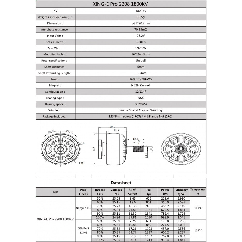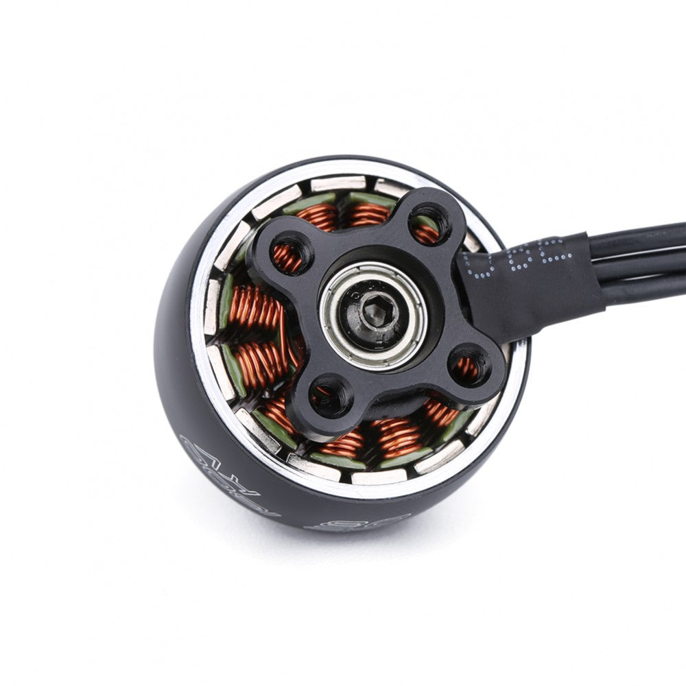 This 2208 sized motor features a High-strength 4mm steel hollow shaft, Single strand windings for performance, M3 shaft screw, and larger 9x4x4mm NSK bearings.